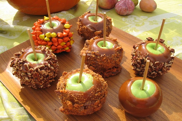 Mix 2 cups sugar, 1/4 cup light corn syrup and 1/2 cup water in a small saucepan. Bring to a boil over medium-high heat, stirring just until the sugar dissolves. Cook, swirling the pan (do not stir), until the mixture is light amber and a candy thermometer registers 320 degrees, 8 to 10 minutes. Remove from the heat; slowly whisk in 1/2 cup heavy cream, then 2 tablespoons unsalted butter, 1 teaspoon vanilla extract and a pinch of salt. Return to low heat and whisk until smooth. Let cool until the caramel is thick enough to coat a spoon. Insert sticks into the stem ends of 6 apples and dip the apples into the caramel, letting the excess drip off. Roll in toppings if desired, then let cool on a parchment-lined baking sheet coated with cooking spray.